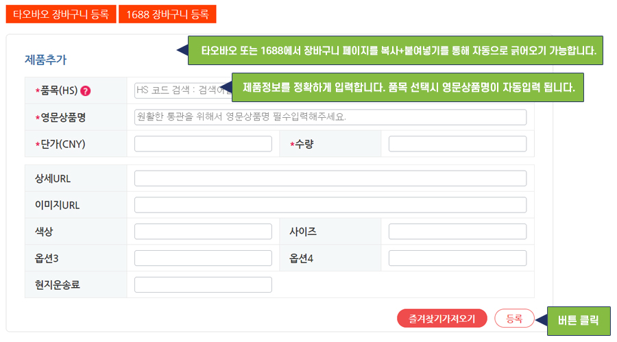 구매대행 신청서 작성 폼에 구매할 상품의 상품명, 품목, 브랜드 및 셀러, 단가, 수량, 제품색상(영문작성), 제품사이즈(영문작성) 등을 정확하게 기입 하신 후 [등록] 버튼 클릭